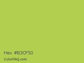 Hex #b3cf50 Color is a normal lime color and the nearest color is Conifer #acdd4d. Hex code #b3cf50 and RGB value is rgb(179,207,80). In RGB color space, this color is composed of 70% red, 81% green, 31% blue, In CMYK color space, this color is composed of 14% cyan, 0% magenta, 61% yellow , 19% black , In HSL color space, this color has a hue angle of 73° , 57% saturation and 56% lightness.