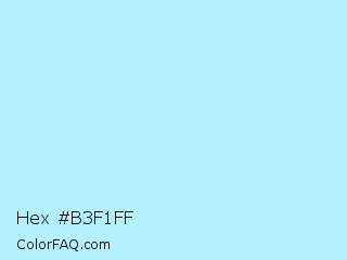 Hex #b3f1ff Color is a very light cyan color and the nearest color is Diamond #b9f2ff. Hex code #b3f1ff and RGB value is rgb(179,241,255). In RGB color space, this color is composed of 70% red, 95% green, 100% blue, In CMYK color space, this color is composed of 30% cyan, 5% magenta, 0% yellow , 0% black , In HSL color space, this color has a hue angle of 191° , 100% saturation and 85% lightness.