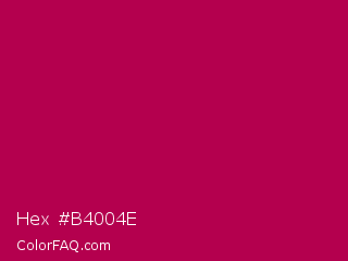 Hex #b4004e Color is a normal rose color and the nearest color is Pictorial Carmine #c30b4e. Hex code #b4004e and RGB value is rgb(180,0,78). In RGB color space, this color is composed of 71% red, 0% green, 31% blue, In CMYK color space, this color is composed of 0% cyan, 100% magenta, 57% yellow , 29% black , In HSL color space, this color has a hue angle of 334° , 100% saturation and 35% lightness.