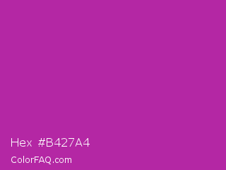 Hex #b427a4 Color is a normal magenta color and the nearest color is Byzantine #bd33a4. Hex code #b427a4 and RGB value is rgb(180,39,164). In RGB color space, this color is composed of 71% red, 15% green, 64% blue, In CMYK color space, this color is composed of 0% cyan, 78% magenta, 9% yellow , 29% black , In HSL color space, this color has a hue angle of 307° , 64% saturation and 43% lightness.