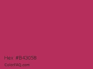 Hex #b43058 Color is a normal rose color and the nearest color is Rich Maroon #b03060. Hex code #b43058 and RGB value is rgb(180,48,88). In RGB color space, this color is composed of 71% red, 19% green, 35% blue, In CMYK color space, this color is composed of 0% cyan, 73% magenta, 51% yellow , 29% black , In HSL color space, this color has a hue angle of 342° , 58% saturation and 45% lightness.