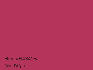 Hex #b4345b Color is a normal rose color and the nearest color is Rich Maroon #b03060. Hex code #b4345b and RGB value is rgb(180,52,91). In RGB color space, this color is composed of 71% red, 20% green, 36% blue, In CMYK color space, this color is composed of 0% cyan, 71% magenta, 49% yellow , 29% black , In HSL color space, this color has a hue angle of 342° , 55% saturation and 45% lightness.