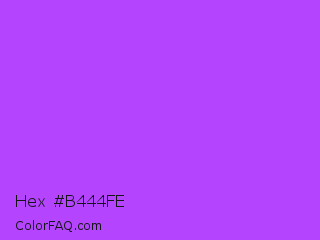 Hex #b444fe Color is a light purple color and the nearest color is Navy Purple #9457eb. Hex code #b444fe and RGB value is rgb(180,68,254). In RGB color space, this color is composed of 71% red, 27% green, 100% blue, In CMYK color space, this color is composed of 29% cyan, 73% magenta, 0% yellow , 0% black , In HSL color space, this color has a hue angle of 276° , 99% saturation and 63% lightness.