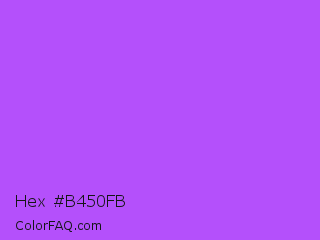 Hex #b450fb Color is a light purple color and the nearest color is Navy Purple #9457eb. Hex code #b450fb and RGB value is rgb(180,80,251). In RGB color space, this color is composed of 71% red, 31% green, 98% blue, In CMYK color space, this color is composed of 28% cyan, 68% magenta, 0% yellow , 2% black , In HSL color space, this color has a hue angle of 275° , 96% saturation and 65% lightness.