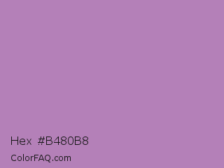 Hex #b480b8 Color is a light magenta color and the nearest color is African Violet #b284be. Hex code #b480b8 and RGB value is rgb(180,128,184). In RGB color space, this color is composed of 71% red, 50% green, 72% blue, In CMYK color space, this color is composed of 2% cyan, 30% magenta, 0% yellow , 28% black , In HSL color space, this color has a hue angle of 296° , 28% saturation and 61% lightness.