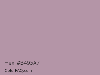 Hex #b495a7 Color is a light magenta color and the nearest color is Lilac Luster #ae98aa. Hex code #b495a7 and RGB value is rgb(180,149,167). In RGB color space, this color is composed of 71% red, 58% green, 65% blue, In CMYK color space, this color is composed of 0% cyan, 17% magenta, 7% yellow , 29% black , In HSL color space, this color has a hue angle of 325° , 17% saturation and 65% lightness.