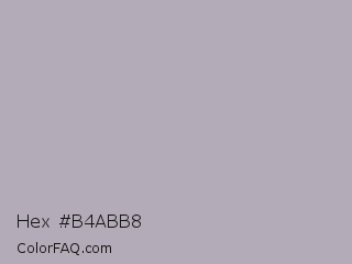 Hex #b4abb8 Color is a light purple color and the nearest color is Bombay #afb1b8. Hex code #b4abb8 and RGB value is rgb(180,171,184). In RGB color space, this color is composed of 71% red, 67% green, 72% blue, In CMYK color space, this color is composed of 2% cyan, 7% magenta, 0% yellow , 28% black , In HSL color space, this color has a hue angle of 282° , 8% saturation and 70% lightness.