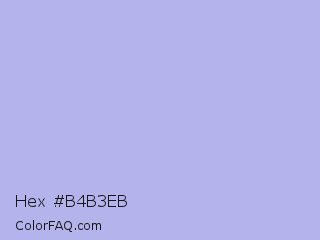 Hex #b4b3eb Color is a very light indigo color and the nearest color is Maximum Blue Purple #acace6. Hex code #b4b3eb and RGB value is rgb(180,179,235). In RGB color space, this color is composed of 71% red, 70% green, 92% blue, In CMYK color space, this color is composed of 23% cyan, 24% magenta, 0% yellow , 8% black , In HSL color space, this color has a hue angle of 241° , 58% saturation and 81% lightness.