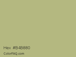 Hex #b4b880 Color is a light yellow color and the nearest color is Misty Moss #bbb477. Hex code #b4b880 and RGB value is rgb(180,184,128). In RGB color space, this color is composed of 71% red, 72% green, 50% blue, In CMYK color space, this color is composed of 2% cyan, 0% magenta, 30% yellow , 28% black , In HSL color space, this color has a hue angle of 64° , 28% saturation and 61% lightness.