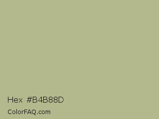 Hex #b4b88d Color is a light yellow color and the nearest color is Swamp Green #acb78e. Hex code #b4b88d and RGB value is rgb(180,184,141). In RGB color space, this color is composed of 71% red, 72% green, 55% blue, In CMYK color space, this color is composed of 2% cyan, 0% magenta, 23% yellow , 28% black , In HSL color space, this color has a hue angle of 66° , 23% saturation and 64% lightness.