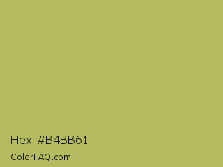 Hex #b4bb61 Color is a normal yellow color and the nearest color is Celery #b8c25d. Hex code #b4bb61 and RGB value is rgb(180,187,97). In RGB color space, this color is composed of 71% red, 73% green, 38% blue, In CMYK color space, this color is composed of 4% cyan, 0% magenta, 48% yellow , 27% black , In HSL color space, this color has a hue angle of 65° , 40% saturation and 56% lightness.