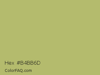 Hex #b4bb6d Color is a normal yellow color and the nearest color is Gimblet #b8b56a. Hex code #b4bb6d and RGB value is rgb(180,187,109). In RGB color space, this color is composed of 71% red, 73% green, 43% blue, In CMYK color space, this color is composed of 4% cyan, 0% magenta, 42% yellow , 27% black , In HSL color space, this color has a hue angle of 65° , 36% saturation and 58% lightness.