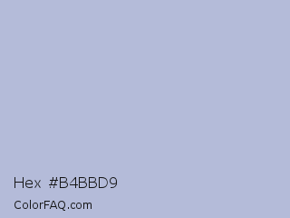Hex #b4bbd9 Color is a light blue color and the nearest color is Pigeon Post #afbdd9. Hex code #b4bbd9 and RGB value is rgb(180,187,217). In RGB color space, this color is composed of 71% red, 73% green, 85% blue, In CMYK color space, this color is composed of 17% cyan, 14% magenta, 0% yellow , 15% black , In HSL color space, this color has a hue angle of 229° , 33% saturation and 78% lightness.