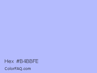 Hex #b4bbfe Color is a very light blue color and the nearest color is Perano #a9bef2. Hex code #b4bbfe and RGB value is rgb(180,187,254). In RGB color space, this color is composed of 71% red, 73% green, 100% blue, In CMYK color space, this color is composed of 29% cyan, 26% magenta, 0% yellow , 0% black , In HSL color space, this color has a hue angle of 234° , 97% saturation and 85% lightness.
