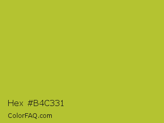 Hex #b4c331 Color is a normal yellow color and the nearest color is Android Green #a4c639. Hex code #b4c331 and RGB value is rgb(180,195,49). In RGB color space, this color is composed of 71% red, 76% green, 19% blue, In CMYK color space, this color is composed of 8% cyan, 0% magenta, 75% yellow , 24% black , In HSL color space, this color has a hue angle of 66° , 60% saturation and 48% lightness.