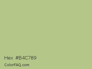 Hex #b4c789 Color is a light lime color and the nearest color is Sage #bcb88a. Hex code #b4c789 and RGB value is rgb(180,199,137). In RGB color space, this color is composed of 71% red, 78% green, 54% blue, In CMYK color space, this color is composed of 10% cyan, 0% magenta, 31% yellow , 22% black , In HSL color space, this color has a hue angle of 78° , 36% saturation and 66% lightness.