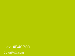 Hex #b4cb00 Color is a normal yellow color and the nearest color is Rio Grande #bbd009. Hex code #b4cb00 and RGB value is rgb(180,203,0). In RGB color space, this color is composed of 71% red, 80% green, 0% blue, In CMYK color space, this color is composed of 11% cyan, 0% magenta, 100% yellow , 20% black , In HSL color space, this color has a hue angle of 67° , 100% saturation and 40% lightness.