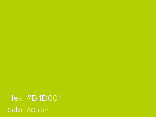 Hex #b4d004 Color is a normal yellow color and the nearest color is Rio Grande #bbd009. Hex code #b4d004 and RGB value is rgb(180,208,4). In RGB color space, this color is composed of 71% red, 82% green, 2% blue, In CMYK color space, this color is composed of 13% cyan, 0% magenta, 98% yellow , 18% black , In HSL color space, this color has a hue angle of 68° , 96% saturation and 42% lightness.
