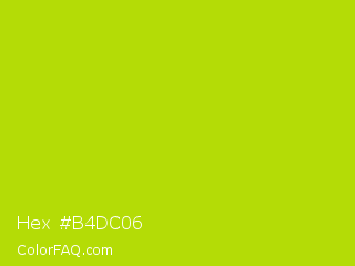 Hex #b4dc06 Color is a normal lime color and the nearest color is Fuego #bede0d. Hex code #b4dc06 and RGB value is rgb(180,220,6). In RGB color space, this color is composed of 71% red, 86% green, 2% blue, In CMYK color space, this color is composed of 18% cyan, 0% magenta, 97% yellow , 14% black , In HSL color space, this color has a hue angle of 71° , 95% saturation and 44% lightness.