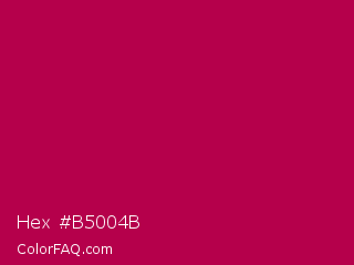 Hex #b5004b Color is a normal rose color and the nearest color is Pictorial Carmine #c30b4e. Hex code #b5004b and RGB value is rgb(181,0,75). In RGB color space, this color is composed of 71% red, 0% green, 29% blue, In CMYK color space, this color is composed of 0% cyan, 100% magenta, 59% yellow , 29% black , In HSL color space, this color has a hue angle of 335° , 100% saturation and 35% lightness.