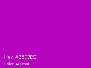 Hex #b503be Color is a normal magenta color and the nearest color is Heliotrope Magenta #aa00bb. Hex code #b503be and RGB value is rgb(181,3,190). In RGB color space, this color is composed of 71% red, 1% green, 75% blue, In CMYK color space, this color is composed of 5% cyan, 98% magenta, 0% yellow , 25% black , In HSL color space, this color has a hue angle of 297° , 97% saturation and 38% lightness.