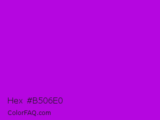 Hex #b506e0 Color is a normal purple color and the nearest color is Vivid Mulberry #b80ce3. Hex code #b506e0 and RGB value is rgb(181,6,224). In RGB color space, this color is composed of 71% red, 2% green, 88% blue, In CMYK color space, this color is composed of 19% cyan, 97% magenta, 0% yellow , 12% black , In HSL color space, this color has a hue angle of 288° , 95% saturation and 45% lightness.