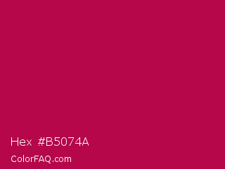 Hex #b5074a Color is a normal rose color and the nearest color is Pictorial Carmine #c30b4e. Hex code #b5074a and RGB value is rgb(181,7,74). In RGB color space, this color is composed of 71% red, 3% green, 29% blue, In CMYK color space, this color is composed of 0% cyan, 96% magenta, 59% yellow , 29% black , In HSL color space, this color has a hue angle of 337° , 93% saturation and 37% lightness.