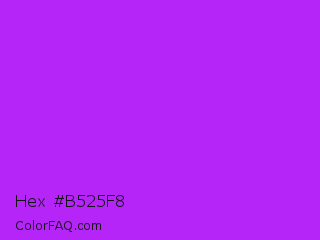 Hex #b525f8 Color is a normal purple color and the nearest color is Veronica #a020f0. Hex code #b525f8 and RGB value is rgb(181,37,248). In RGB color space, this color is composed of 71% red, 15% green, 97% blue, In CMYK color space, this color is composed of 27% cyan, 85% magenta, 0% yellow , 3% black , In HSL color space, this color has a hue angle of 281° , 94% saturation and 56% lightness.