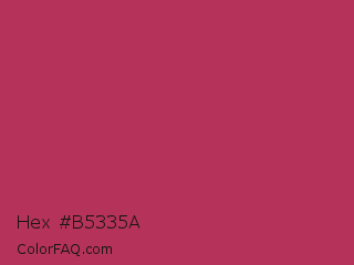 Hex #b5335a Color is a normal rose color and the nearest color is Rich Maroon #b03060. Hex code #b5335a and RGB value is rgb(181,51,90). In RGB color space, this color is composed of 71% red, 20% green, 35% blue, In CMYK color space, this color is composed of 0% cyan, 72% magenta, 50% yellow , 29% black , In HSL color space, this color has a hue angle of 342° , 56% saturation and 45% lightness.