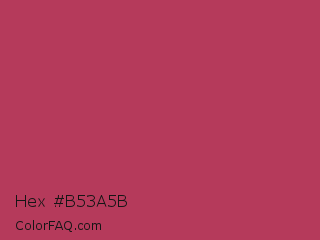 Hex #b53a5b Color is a normal rose color and the nearest color is Night Shadz #aa375a. Hex code #b53a5b and RGB value is rgb(181,58,91). In RGB color space, this color is composed of 71% red, 23% green, 36% blue, In CMYK color space, this color is composed of 0% cyan, 68% magenta, 50% yellow , 29% black , In HSL color space, this color has a hue angle of 344° , 51% saturation and 47% lightness.
