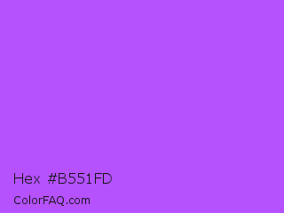 Hex #b551fd Color is a light purple color and the nearest color is Navy Purple #9457eb. Hex code #b551fd and RGB value is rgb(181,81,253). In RGB color space, this color is composed of 71% red, 32% green, 99% blue, In CMYK color space, this color is composed of 28% cyan, 68% magenta, 0% yellow , 1% black , In HSL color space, this color has a hue angle of 275° , 98% saturation and 65% lightness.