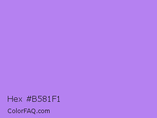 Hex #b581f1 Color is a light violet color and the nearest color is Lavender #b57edc. Hex code #b581f1 and RGB value is rgb(181,129,241). In RGB color space, this color is composed of 71% red, 51% green, 95% blue, In CMYK color space, this color is composed of 25% cyan, 46% magenta, 0% yellow , 5% black , In HSL color space, this color has a hue angle of 268° , 80% saturation and 73% lightness.