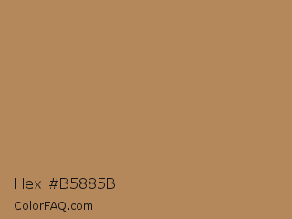 Hex #b5885b Color is a normal orange color and the nearest color is Deer #ba8759. Hex code #b5885b and RGB value is rgb(181,136,91). In RGB color space, this color is composed of 71% red, 53% green, 36% blue, In CMYK color space, this color is composed of 0% cyan, 25% magenta, 50% yellow , 29% black , In HSL color space, this color has a hue angle of 30° , 38% saturation and 53% lightness.