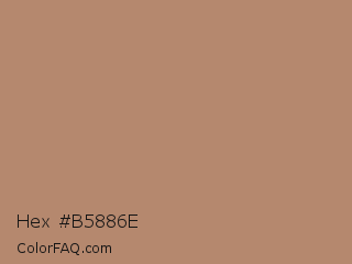 Hex #b5886e Color is a normal orange color and the nearest color is Light Taupe #b38b6d. Hex code #b5886e and RGB value is rgb(181,136,110). In RGB color space, this color is composed of 71% red, 53% green, 43% blue, In CMYK color space, this color is composed of 0% cyan, 25% magenta, 39% yellow , 29% black , In HSL color space, this color has a hue angle of 22° , 32% saturation and 57% lightness.