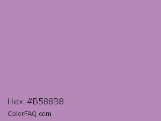 Hex #b588b8 Color is a light magenta color and the nearest color is African Violet #b284be. Hex code #b588b8 and RGB value is rgb(181,136,184). In RGB color space, this color is composed of 71% red, 53% green, 72% blue, In CMYK color space, this color is composed of 2% cyan, 26% magenta, 0% yellow , 28% black , In HSL color space, this color has a hue angle of 296° , 25% saturation and 63% lightness.