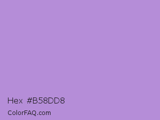 Hex #b58dd8 Color is a light purple color and the nearest color is East Side #ac91ce. Hex code #b58dd8 and RGB value is rgb(181,141,216). In RGB color space, this color is composed of 71% red, 55% green, 85% blue, In CMYK color space, this color is composed of 16% cyan, 35% magenta, 0% yellow , 15% black , In HSL color space, this color has a hue angle of 272° , 49% saturation and 70% lightness.