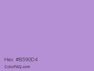 Hex #b590d4 Color is a light purple color and the nearest color is East Side #ac91ce. Hex code #b590d4 and RGB value is rgb(181,144,212). In RGB color space, this color is composed of 71% red, 56% green, 83% blue, In CMYK color space, this color is composed of 15% cyan, 32% magenta, 0% yellow , 17% black , In HSL color space, this color has a hue angle of 273° , 44% saturation and 70% lightness.