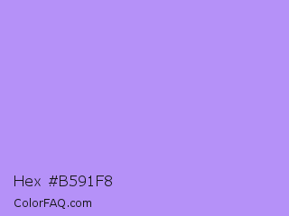 Hex #b591f8 Color is a light violet color and the nearest color is Biloba Flower #b2a1ea. Hex code #b591f8 and RGB value is rgb(181,145,248). In RGB color space, this color is composed of 71% red, 57% green, 97% blue, In CMYK color space, this color is composed of 27% cyan, 42% magenta, 0% yellow , 3% black , In HSL color space, this color has a hue angle of 261° , 88% saturation and 77% lightness.