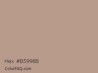 Hex #b5998b Color is a light orange color and the nearest color is Quicksand #bd978e. Hex code #b5998b and RGB value is rgb(181,153,139). In RGB color space, this color is composed of 71% red, 60% green, 55% blue, In CMYK color space, this color is composed of 0% cyan, 15% magenta, 23% yellow , 29% black , In HSL color space, this color has a hue angle of 20° , 22% saturation and 63% lightness.
