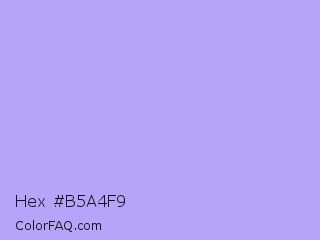 Hex #b5a4f9 Color is a very light indigo color and the nearest color is Biloba Flower #b2a1ea. Hex code #b5a4f9 and RGB value is rgb(181,164,249). In RGB color space, this color is composed of 71% red, 64% green, 98% blue, In CMYK color space, this color is composed of 27% cyan, 34% magenta, 0% yellow , 2% black , In HSL color space, this color has a hue angle of 252° , 88% saturation and 81% lightness.