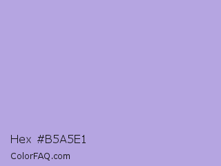 Hex #b5a5e1 Color is a light indigo color and the nearest color is Biloba Flower #b2a1ea. Hex code #b5a5e1 and RGB value is rgb(181,165,225). In RGB color space, this color is composed of 71% red, 65% green, 88% blue, In CMYK color space, this color is composed of 20% cyan, 27% magenta, 0% yellow , 12% black , In HSL color space, this color has a hue angle of 256° , 50% saturation and 76% lightness.