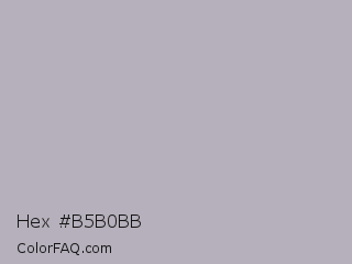 Hex #b5b0bb Color is a light violet color and the nearest color is Bombay #afb1b8. Hex code #b5b0bb and RGB value is rgb(181,176,187). In RGB color space, this color is composed of 71% red, 69% green, 73% blue, In CMYK color space, this color is composed of 3% cyan, 6% magenta, 0% yellow , 27% black , In HSL color space, this color has a hue angle of 267° , 7% saturation and 71% lightness.