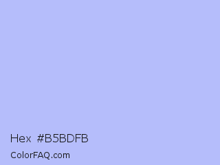 Hex #b5bdfb Color is a very light blue color and the nearest color is Perano #a9bef2. Hex code #b5bdfb and RGB value is rgb(181,189,251). In RGB color space, this color is composed of 71% red, 74% green, 98% blue, In CMYK color space, this color is composed of 28% cyan, 25% magenta, 0% yellow , 2% black , In HSL color space, this color has a hue angle of 233° , 90% saturation and 85% lightness.