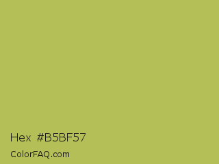 Hex #b5bf57 Color is a normal yellow color and the nearest color is Celery #b8c25d. Hex code #b5bf57 and RGB value is rgb(181,191,87). In RGB color space, this color is composed of 71% red, 75% green, 34% blue, In CMYK color space, this color is composed of 5% cyan, 0% magenta, 54% yellow , 25% black , In HSL color space, this color has a hue angle of 66° , 45% saturation and 55% lightness.