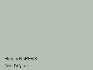 Hex #b5bfb3 Color is a light green color and the nearest color is Ash Gray #b2beb5. Hex code #b5bfb3 and RGB value is rgb(181,191,179). In RGB color space, this color is composed of 71% red, 75% green, 70% blue, In CMYK color space, this color is composed of 5% cyan, 0% magenta, 6% yellow , 25% black , In HSL color space, this color has a hue angle of 110° , 9% saturation and 73% lightness.