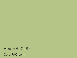 Hex #b5c487 Color is a light lime color and the nearest color is Sage #bcb88a. Hex code #b5c487 and RGB value is rgb(181,196,135). In RGB color space, this color is composed of 71% red, 77% green, 53% blue, In CMYK color space, this color is composed of 8% cyan, 0% magenta, 31% yellow , 23% black , In HSL color space, this color has a hue angle of 75° , 34% saturation and 65% lightness.
