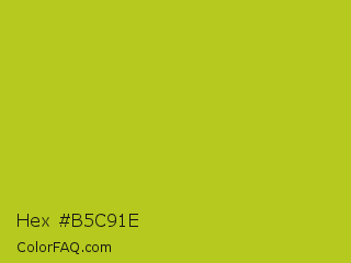 Hex #b5c91e Color is a normal yellow color and the nearest color is Key Lime Pie #bfc921. Hex code #b5c91e and RGB value is rgb(181,201,30). In RGB color space, this color is composed of 71% red, 79% green, 12% blue, In CMYK color space, this color is composed of 10% cyan, 0% magenta, 85% yellow , 21% black , In HSL color space, this color has a hue angle of 67° , 74% saturation and 45% lightness.