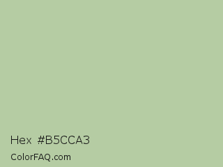 Hex #b5cca3 Color is a light green color and the nearest color is Rainee #b9c8ac. Hex code #b5cca3 and RGB value is rgb(181,204,163). In RGB color space, this color is composed of 71% red, 80% green, 64% blue, In CMYK color space, this color is composed of 11% cyan, 0% magenta, 20% yellow , 20% black , In HSL color space, this color has a hue angle of 94° , 29% saturation and 72% lightness.