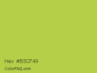 Hex #b5cf49 Color is a normal lime color and the nearest color is Conifer #acdd4d. Hex code #b5cf49 and RGB value is rgb(181,207,73). In RGB color space, this color is composed of 71% red, 81% green, 29% blue, In CMYK color space, this color is composed of 13% cyan, 0% magenta, 65% yellow , 19% black , In HSL color space, this color has a hue angle of 72° , 58% saturation and 55% lightness.