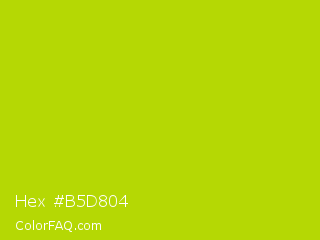 Hex #b5d804 Color is a normal yellow color and the nearest color is Rio Grande #bbd009. Hex code #b5d804 and RGB value is rgb(181,216,4). In RGB color space, this color is composed of 71% red, 85% green, 2% blue, In CMYK color space, this color is composed of 16% cyan, 0% magenta, 98% yellow , 15% black , In HSL color space, this color has a hue angle of 70° , 96% saturation and 43% lightness.